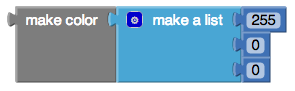 make color takes in a list of 3 or 4 numbers. These numbers in this list represent values in an RGB code. RGB codes are used to make colors on the Internet. An RGB color chart is available here. This first number in this list represents the R value of the code. The second represents the G. The third represents the B. The fourth value is optional and represents the alpha value or how saturated the color is. The default alpha value is 100. Experiment with different values and see how the colors change using this block.