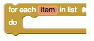 Runs the blocks in the do section for each item in the list. Use the given variable name, item, to refer to the current list item. You can change the name item to something else if you wish.