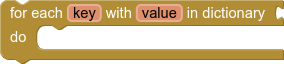 Runs the blocks in the do section for each key-value entry in the dictionary. Use the given variables, key and value, to refer to the key and value of the current dictionary entry. You can change the names key and value to something else if you wish.