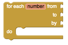 Runs the blocks in the do section for each numeric value in the range starting from from and ending at to, incrementing number by the value of by each time. Use the given variable name, number, to refer to the current value. You can change the name number to something else if you wish.